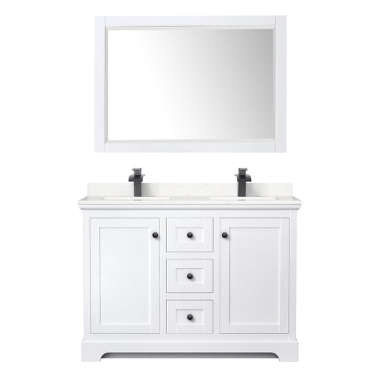 Avery 48" Double Vanity in White, No Top, No Sinks, Matte Black Trim, 46" Mirror