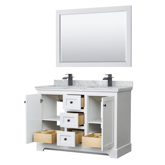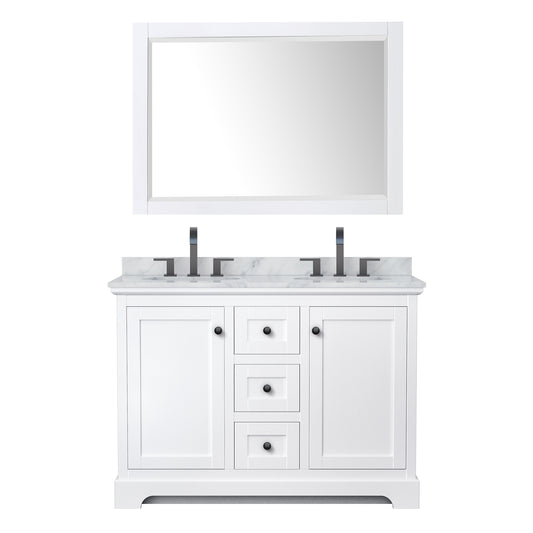 Avery 48" Double Vanity in White, Carrara Marble Top, Black Trim, 46" Mirror