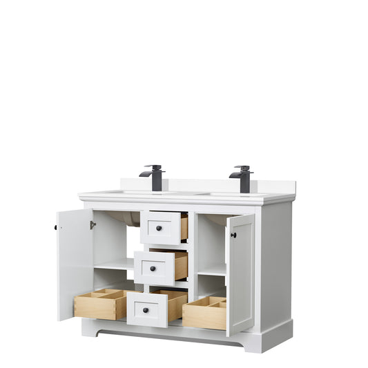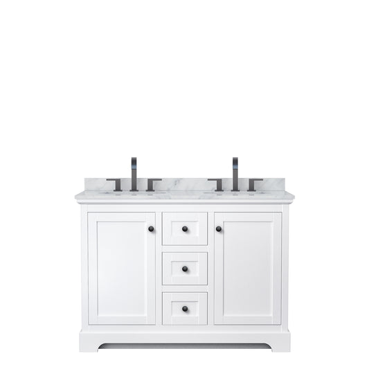 Avery 48" Double Vanity in White, Carrara Cultured Marble Top, Black Trim