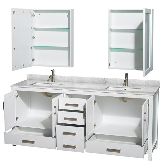 Sheffield 80" Double Vanity in White, Carrara Marble Top, Medicine Cabinets