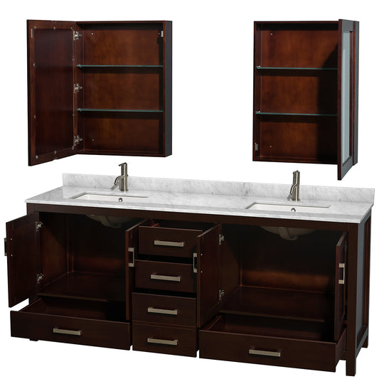 Sheffield 80" Double Vanity in Espresso, White Marble Top, Medicine Cabinets