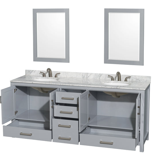 Sheffield 80" Double Vanity in Gray, Carrara Marble Top, Square 24" Mirrors