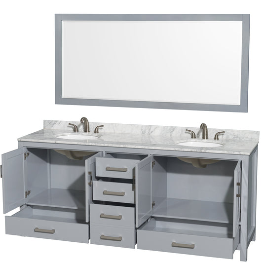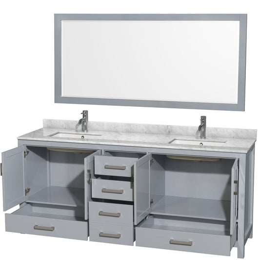 Sheffield 80" Double Vanity in Gray, Carrara Marble Top, Square 70" Mirror