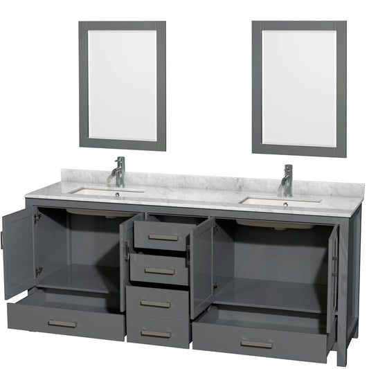 Sheffield 80" Double Vanity in Dark Gray, White Marble Top, Square 24" Mirrors