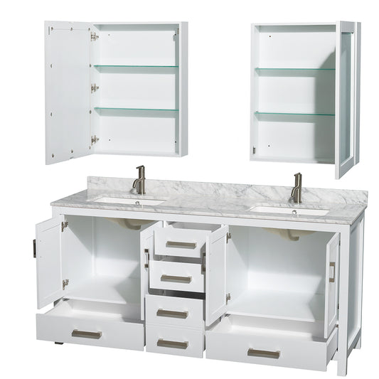 Sheffield 72" Double Vanity in White, White Marble Top, Square Medicine Cabinets