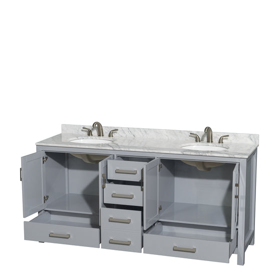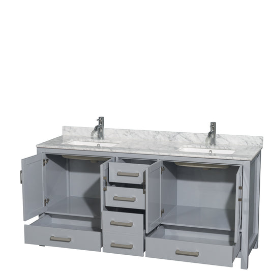 Sheffield 72" Double Vanity in Gray, Carrara Marble Top, Square No Mirror