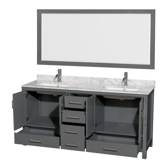 Sheffield 72" Double Vanity in Dark Gray, Carrara Marble Top, Square 70" Mirror