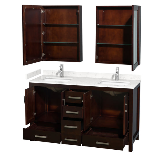 Sheffield 60" Double Vanity in Espresso, White Marble Top, Medicine Cabinets