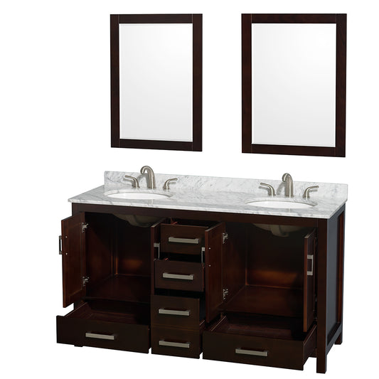 Sheffield 60" Double Vanity in Espresso, Carrara Marble Top, Medicine Cabinets