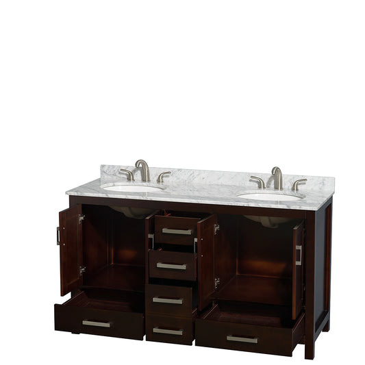 Sheffield 60" Double Vanity in Espresso, Carrara Marble Top, Square No Mirror