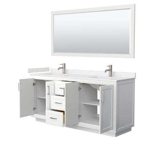 Miranda 72" Double Vanity in White, Carrara Marble Top, Nickel Trim, 70" Mirror