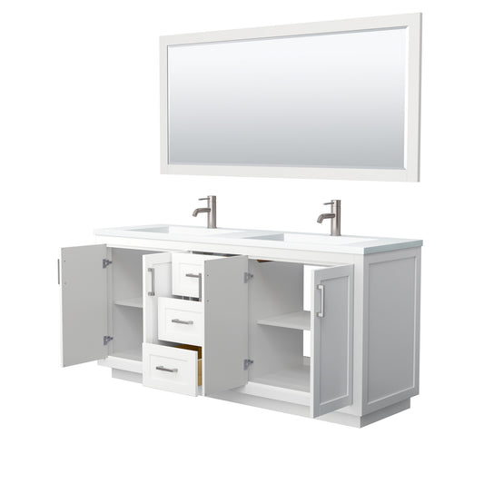 Miranda 72" Double Vanity in White, 1.25" White Top, Nickel Trim, 70" Mirror