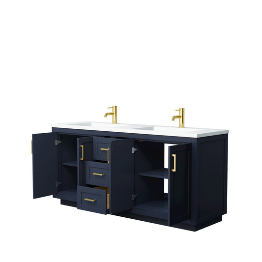 Miranda 72" Dark Blue Double Vanity, 1.25" White Top, Integrated Gold Trim