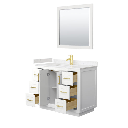 Miranda 42" Single Vanity in White, Carrara Marble Top, Gold Trim, 34" Mirror