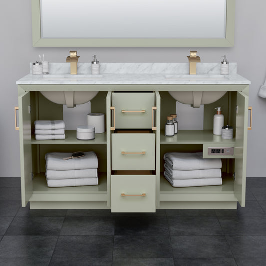 Strada 60" Green Double Vanity, White Marble Top, Sinks, Bronze Trim, 58" Mirror