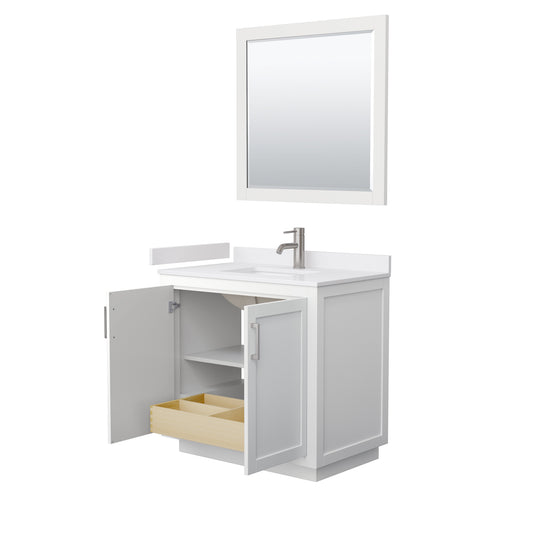 Miranda 36" Single Vanity in White, White Marble Top, Nickel Trim, 34" Mirror