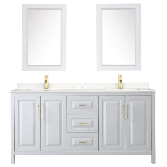 Daria 72" White Double Vanity, White Marble Top, 24" Mirrors, Brushed Gold Trim