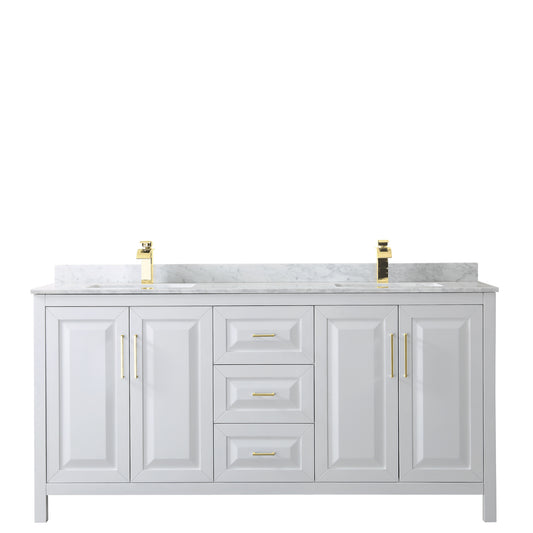 Daria 72" White Double Vanity, White Marble Top, 70" Mirror, Brushed Gold Trim