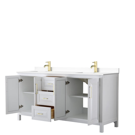 Daria 72" Double Vanity in White, White Cultured Marble Top, Gold Trim