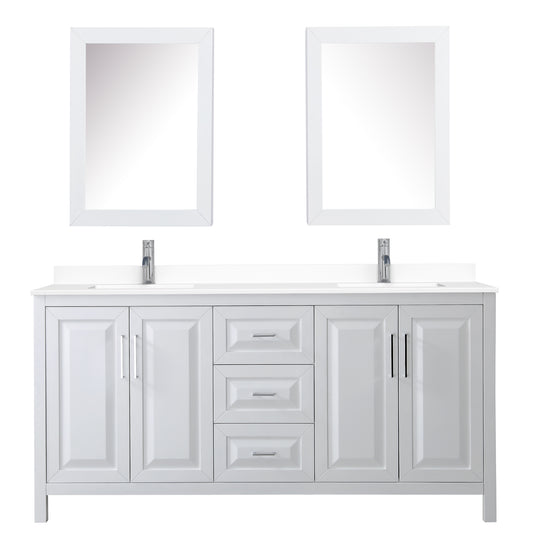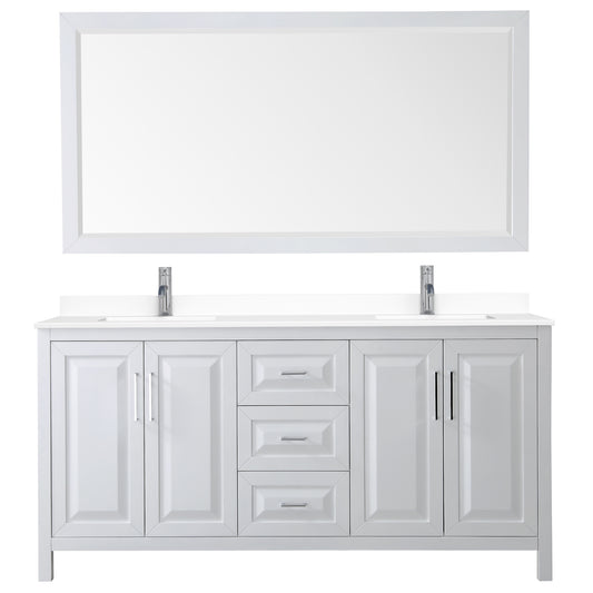 Daria 72" Double Vanity in White, White Cultured Marble Top, Sinks, 70" Mirror