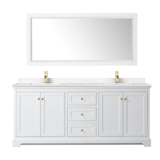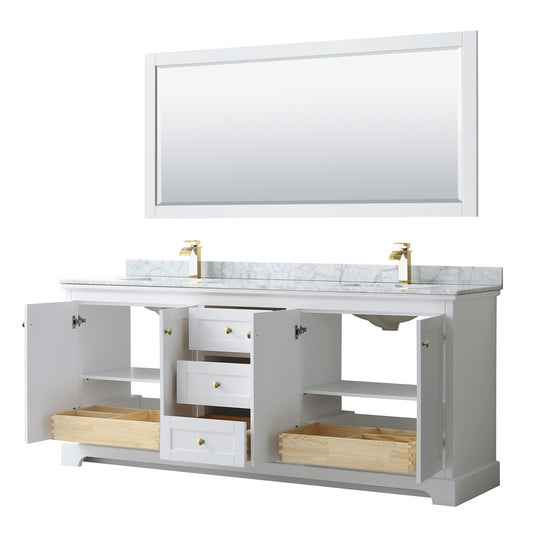 Avery 80" Double Vanity in White, Top, Square 70" Mirror, Brushed Gold Trim