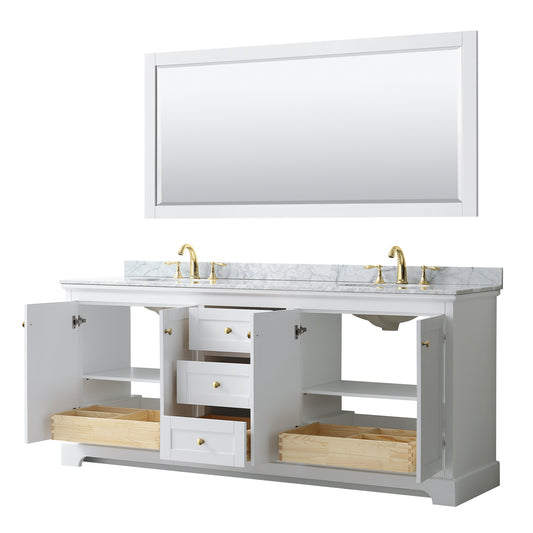 Avery 80" Double Vanity in White, Top, Oval Sinks, 70" Mirror, Brushed Gold Trim