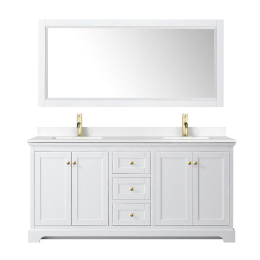 Avery 72" White Double Vanity, White Marble Top, 70" Mirror, Brushed Gold Trim