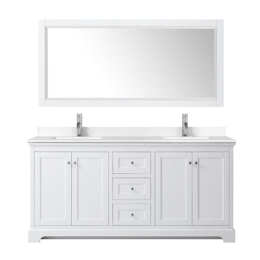 Avery 72" Double Vanity in White, White Cultured Marble Top, Sinks, 70" Mirror