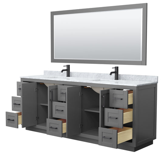 Miranda 84" Double Vanity in Dark Gray, White Marble Top, Black Trim, 70" Mirror