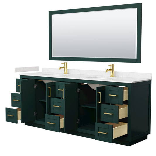 Miranda 84" Double Vanity in Green, Carrara Marble Top, Gold Trim, 70" Mirror