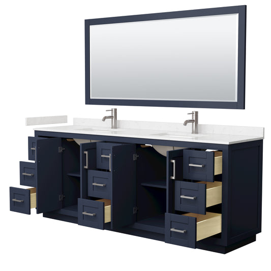 Miranda 84" Dark Blue Double Vanity, White Marble Top, Nickel Trim, 70" Mirror