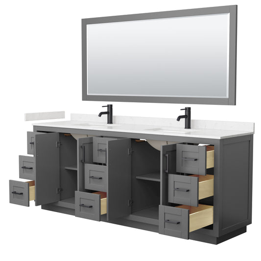 Miranda 84" Dark Gray Double Vanity, Carrara Marble Top, Black Trim, 70" Mirror