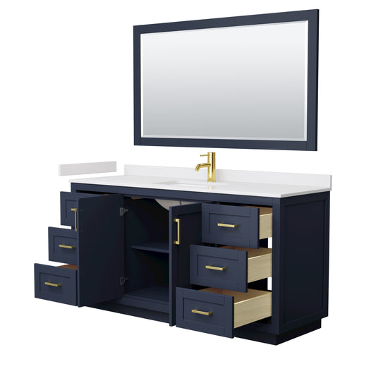 Miranda 66" Single Vanity in Dark Blue, White Marble Top, Gold Trim, 58" Mirror