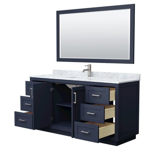 Miranda 66" Single Vanity in Dark Blue, White Marble Top, Black Trim, 58" Mirror