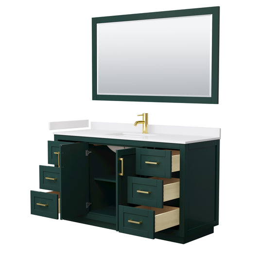 Miranda 60" Single Vanity in Green, White Marble Top, Gold Trim, 58" Mirror