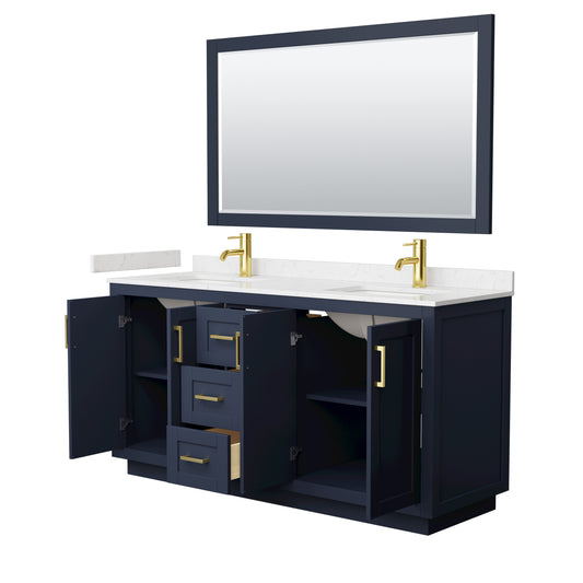 Miranda 66" Dark Blue Double Vanity, Carrara Marble Top, Gold Trim, 58" Mirror