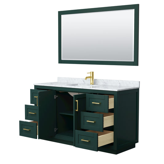 Miranda 60" Single Vanity in Green, Carrara Marble Top, Gold Trim, 58" Mirror
