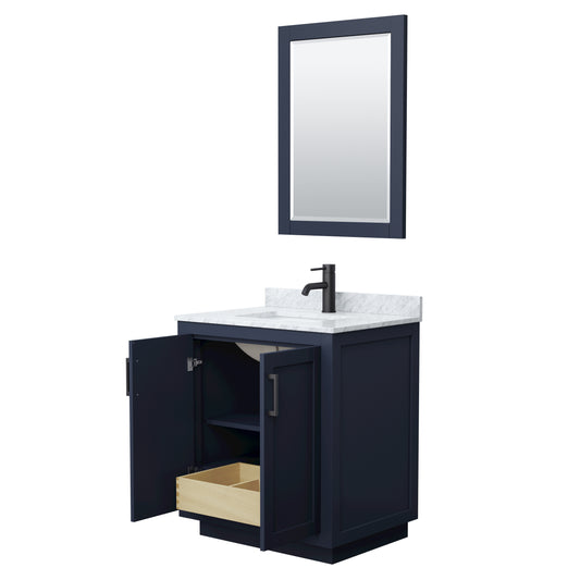 Miranda 30" Single Vanity in Dark Blue, White Marble Top, Black Trim, 24" Mirror
