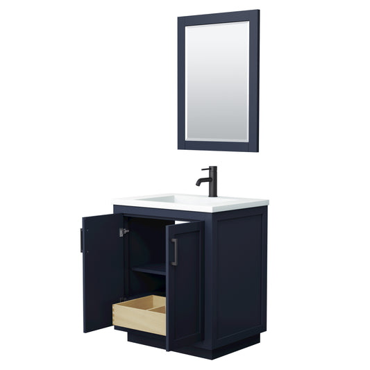 Miranda 30" Dark Blue Single Vanity, 1.25" White Top, Black Trim, 24" Mirror