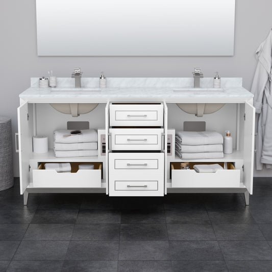 Marlena 72 " White Double Vanity, White Carrara Marble Top, Sinks, Nickel Trim