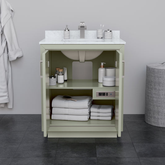 Icon 30" Single Vanity in Light Green, White Marble Top, Nickel Trim, 24" Mirror