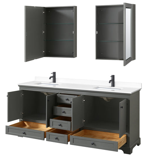 Deborah 80" Gray Double Vanity, White Marble Top, Black Trim, Medicine Cabinets