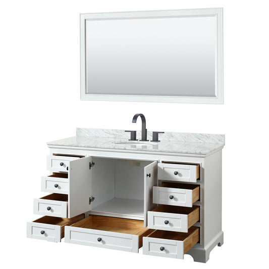Deborah 60" Single Vanity in White, Carrara Marble Top, Black Trim, 58" Mirror