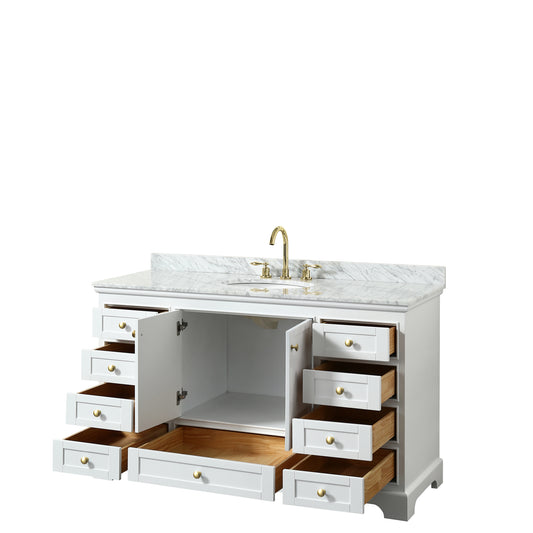 Deborah 60" Single Vanity in White, Carrara Marble Top, Gold Trim, No Mirror