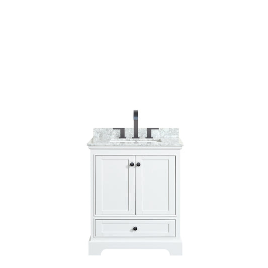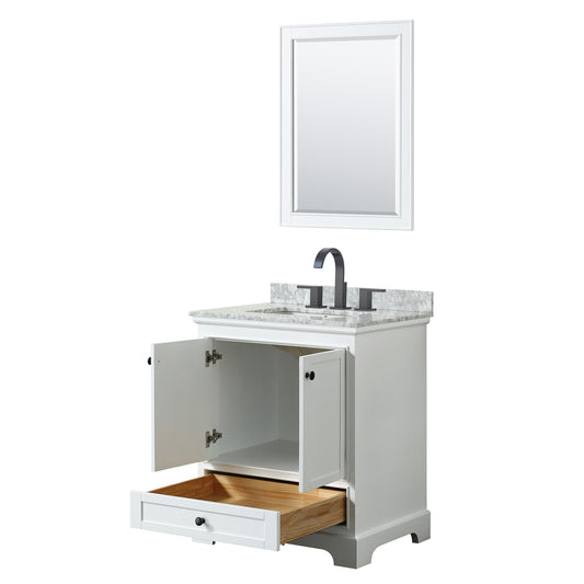 Deborah 30" White Single Vanity, Carrara Marble Top, Trim, Medicine Cabinet