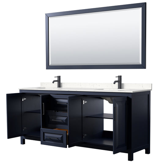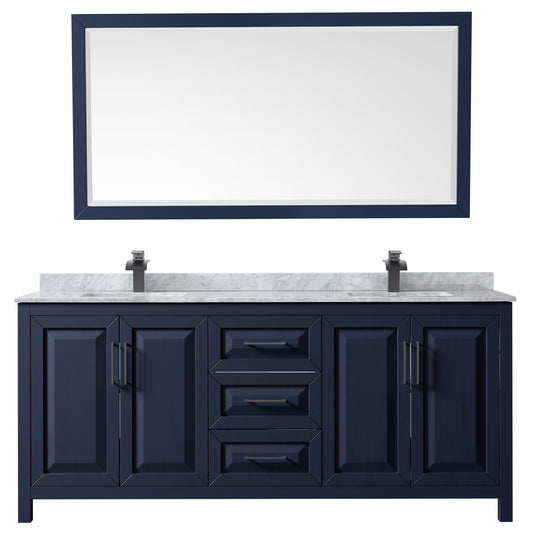 Daria 80" Double Vanity in Dark Blue, Carrara Marble Top, Black Trim, 70" Mirror