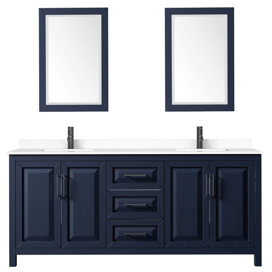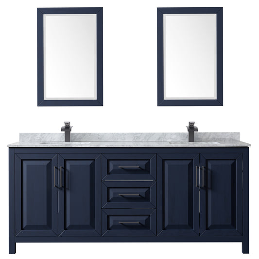 Daria 80" Double Vanity in Dark Blue, White Marble Top, Black Trim, 24" Mirrors
