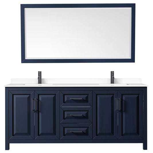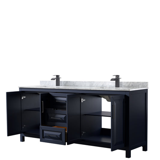 Daria 80" Double Vanity in Dark Blue, White Marble Top, Black Trim, 70" Mirror
