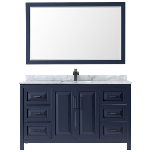 Daria 60" Single Vanity in Dark Blue, Carrara Marble Top, Black Trim, 58" Mirror