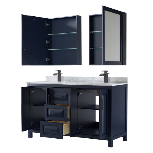 Daria 60" Blue Double Vanity, White Marble Top, Black Trim, Medicine Cabinets